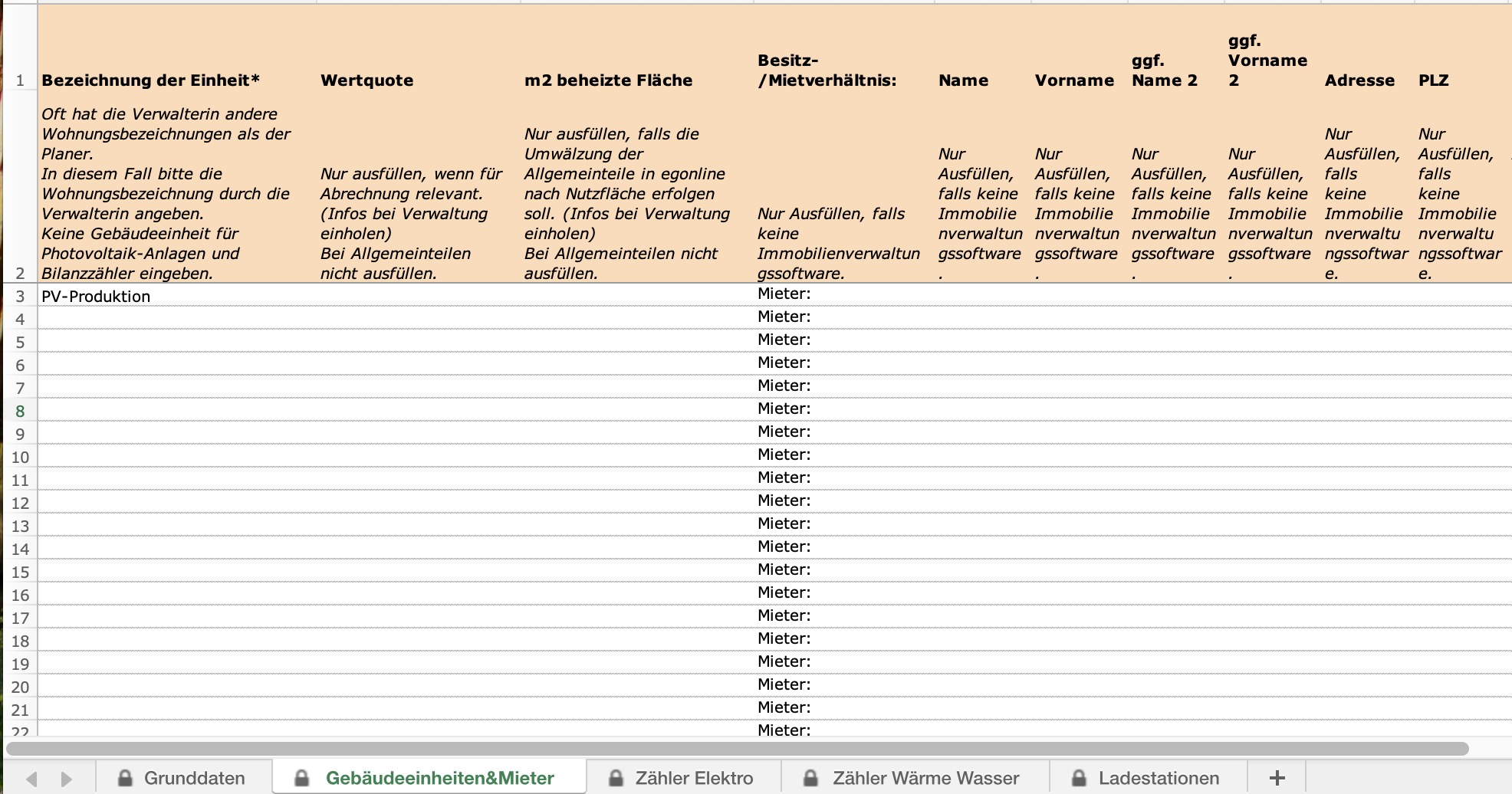 Die Blätter “Zähler Wärme Wasser” und “Ladestationen” können Sie leer lassen.