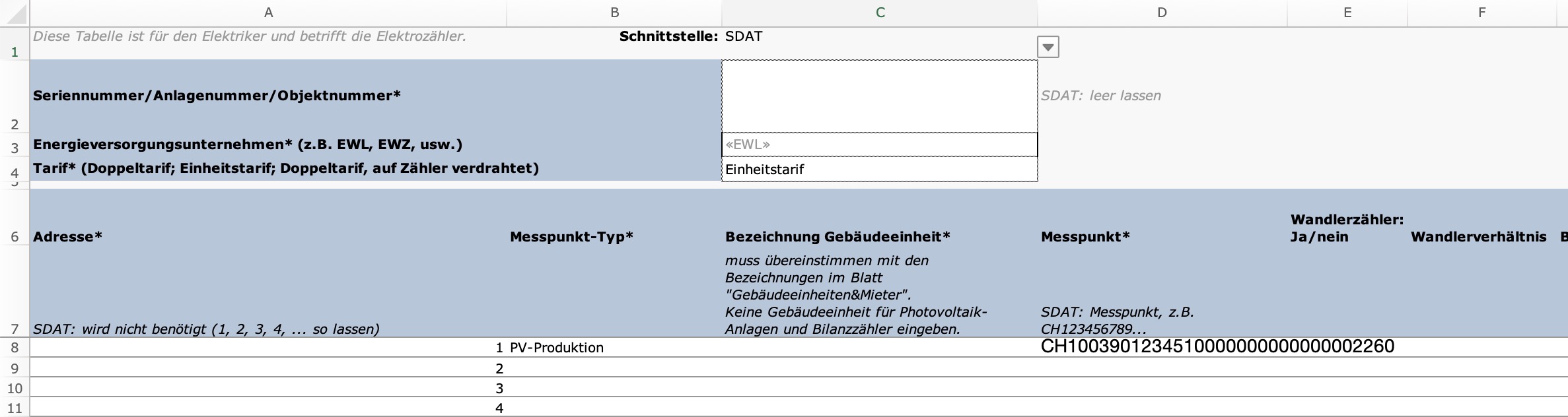 3. Tragen Sie in Feld D8 die Messpunktnummer des PV-Zählers ein